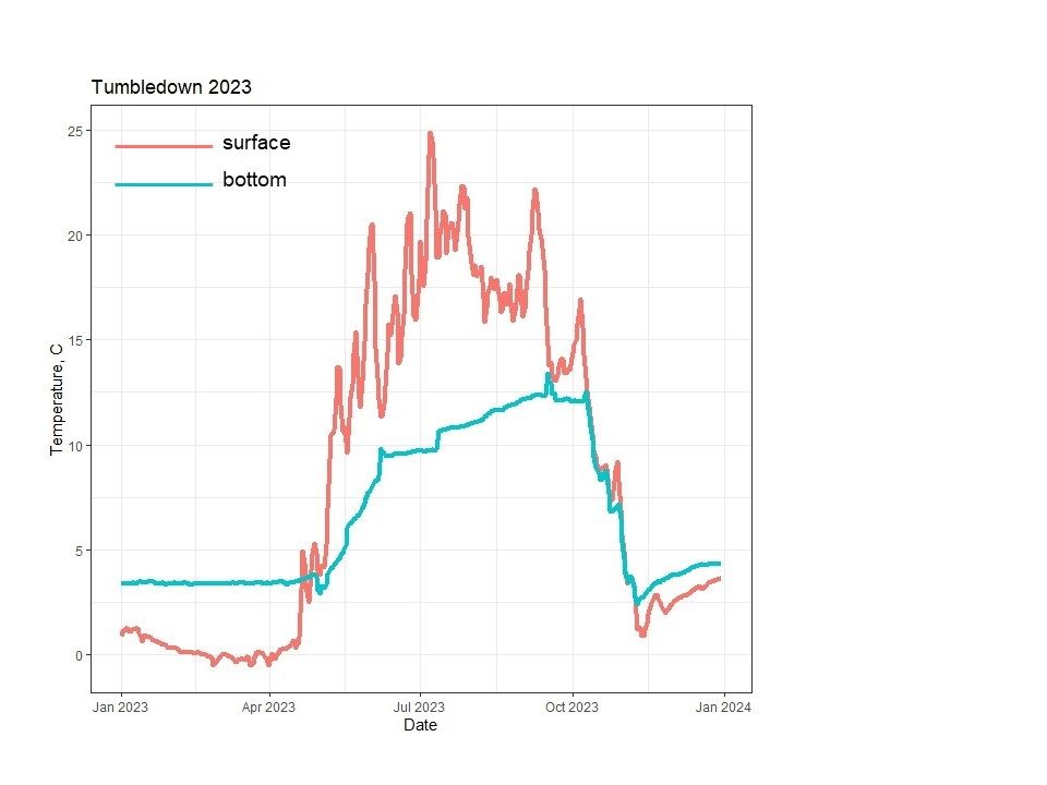Water temperatures have been collected just below the surface and at the bottom of Tumbledown Pond every 30 minutes since the summer of 2007. These high-resolution temperature data allow us to capture the details of seasonal transitions and stratification patterns on the pond. For instance, temperature data from 2023 (below) illustrate winter and summer stratification, separated by periods of lake mixing in the spring and autumn. Following ice breakup in the spring, the surface waters warm quickly and then undergo subsequent warmer and cooler periods through the summer. The bottom of the lake warms during the summer, but temperatures remain lower than the surface and remain more stable until late September, when the first in a series of fall turnover events occurs. When ice cover is re-established on the pond, water at the bottom warms slowly from heat stored in the sediment, and winter stratification is re-established.