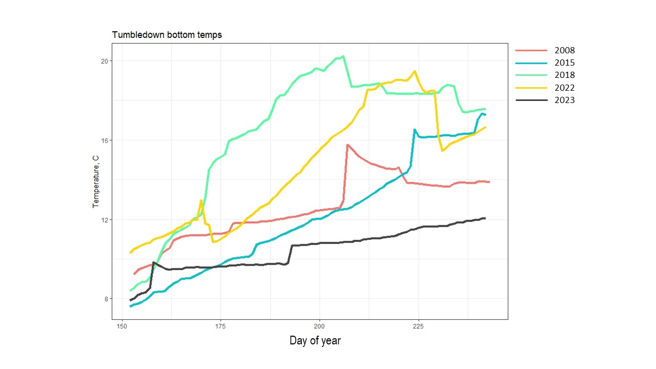 The daily average water temperatures at the surface and bottom of Tumbledown Pond from June-August across reveal different patterns across years. There is a lot of short-term variability in surface temperature, but most years share a similar overall trend. At the bottom of the pond, temperature trajectories vary quite a bit from year to year, and in some years, the lake bottom warms considerably. Abrupt changes in bottom temperature are usually the result of a wind-driven mixing event that brings surface water downward.