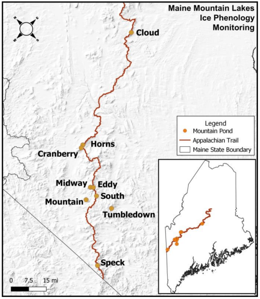 The Maine Mountain Ponds project has been monitoring ice phenology in 9 mountain ponds for > 10 years using water temperature and, when available, satellite imagery.
